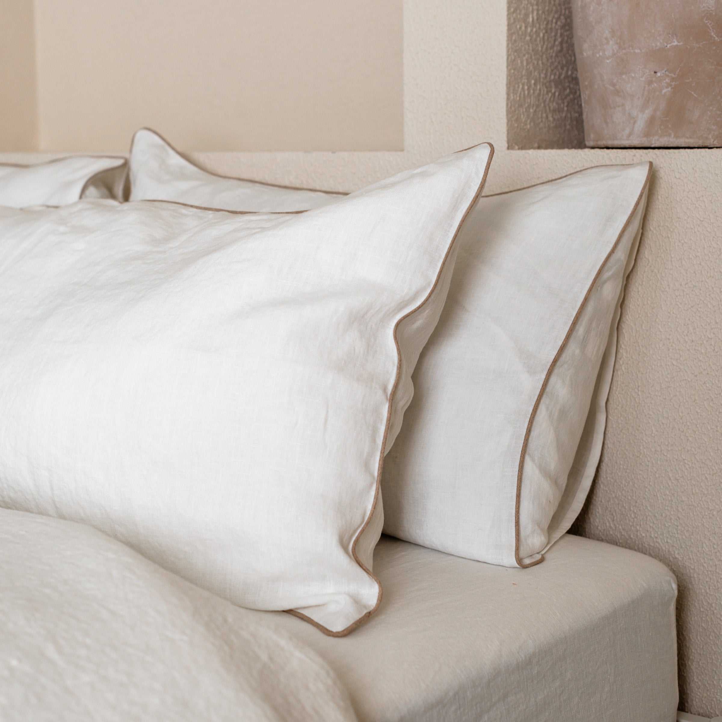 Weißes Bettwäsche-Set aus Leinen mit naturfarbener Paspel